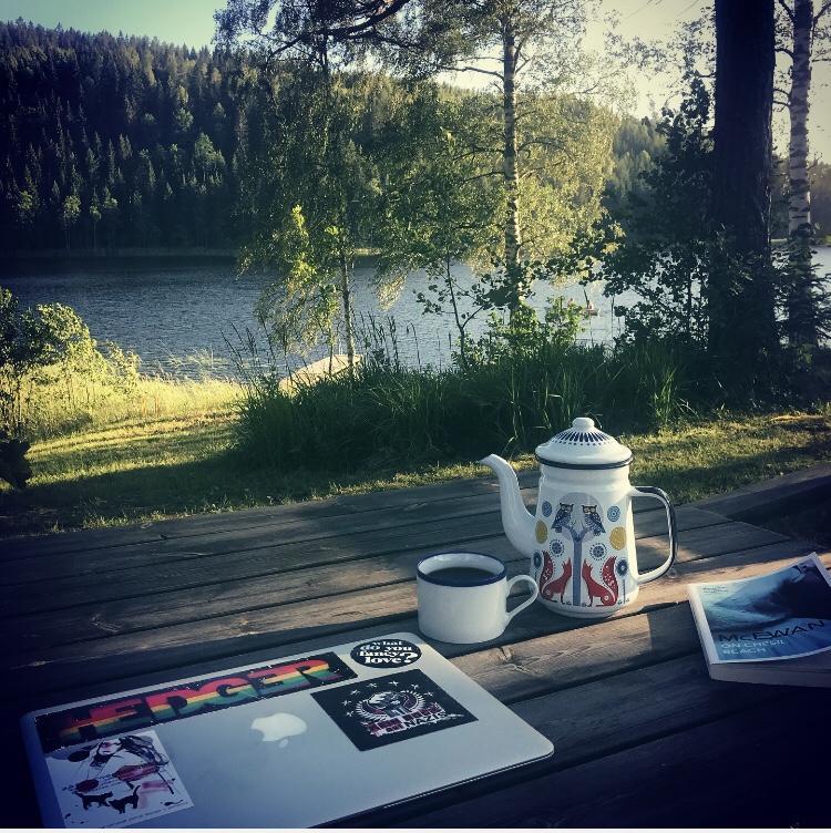 I had packed my laptop for the trip, announcing I wanted to write. Every day. The first week I didn’t even touch the bag containing the computer. I could argue it’s because of the kids. Or constantly being on the road. Truth is, it’s been the huge amount of reading and soaking in impressions of Norway that got me fully occupied. When we arrived in Sweden I booked this place at the lake. One of the reviews to the house stated that they would have wanted to stay a whole month to write a novel. The review summed it up nicely. When I got out of the car and looked around, I drew in my breath and knew: this place is perfect for writing. I just wish everyone else on my traveling party had known, too. I can draw a pretty nice picture of what happened next. Please, switch on the imaginary sound.